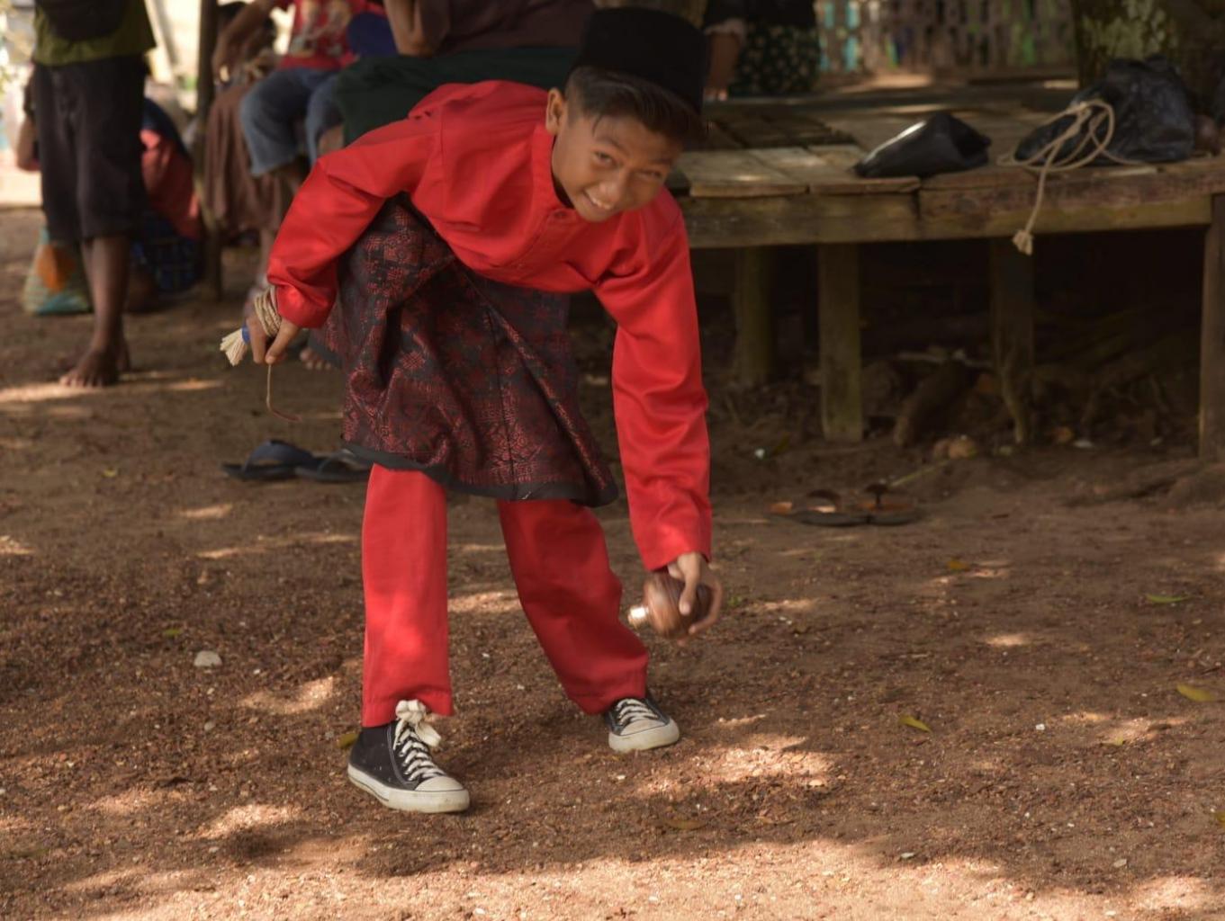 Gasing dimainkan oleh 5 orang dalam 1 Tim, dengan cara melilitkan tali keleher gasing, lalu ayunkan gasing tersebut ke arah tanah atau ketempat arena dan lepaskan tali dengan cepat.